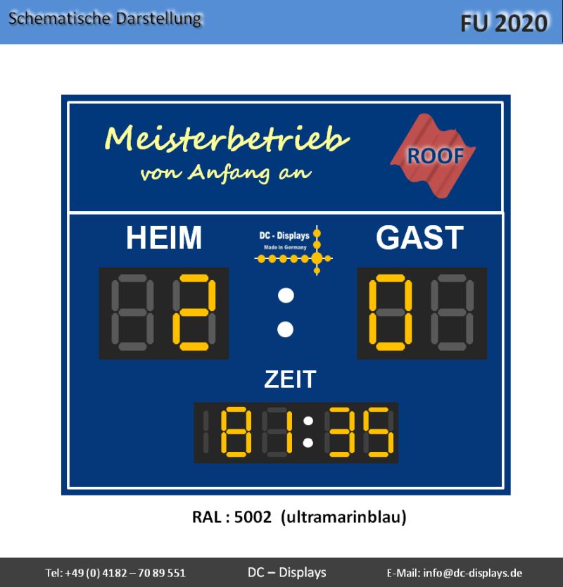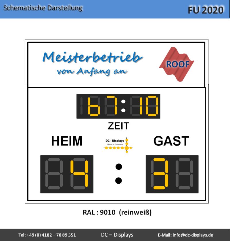 Die FU-2020 Anzeige hat eine Gesamtfläche von beachtlichen 6,25 m². Zur zusätzliches Features können Sie den Vereins-Namen und das Logo im oberen Bereich gleich mitbestellt werden. Die Spielstände und Spielzeiten sind über größere Distanzen gut zu erkennen.