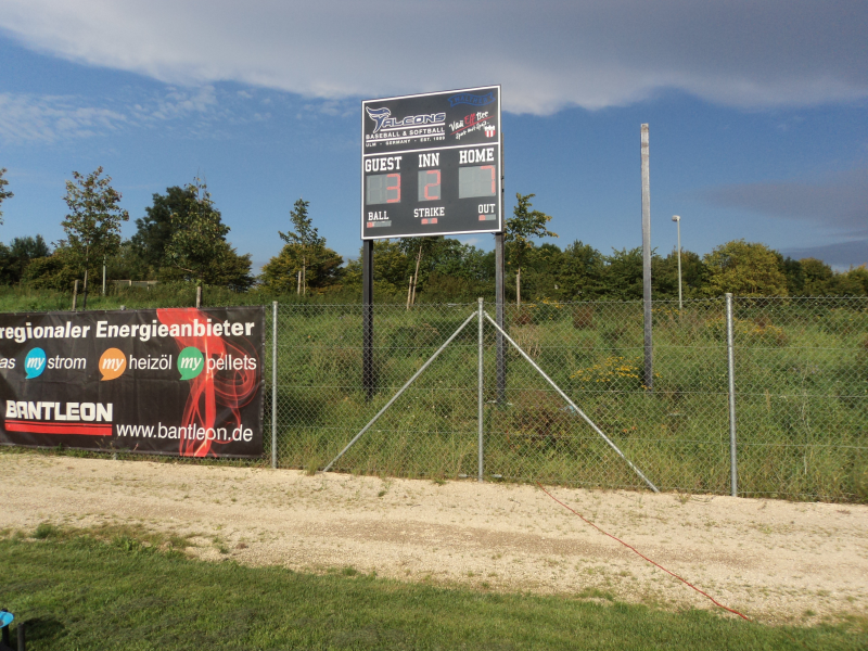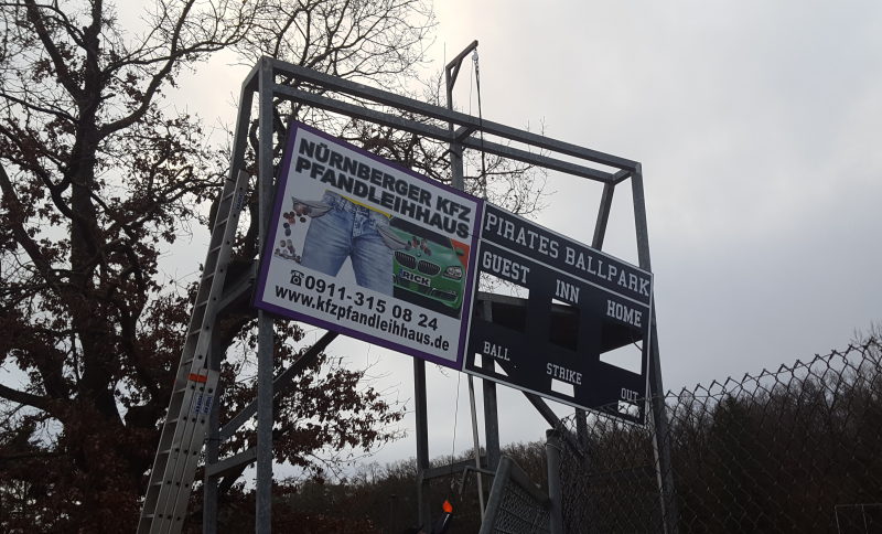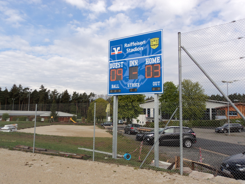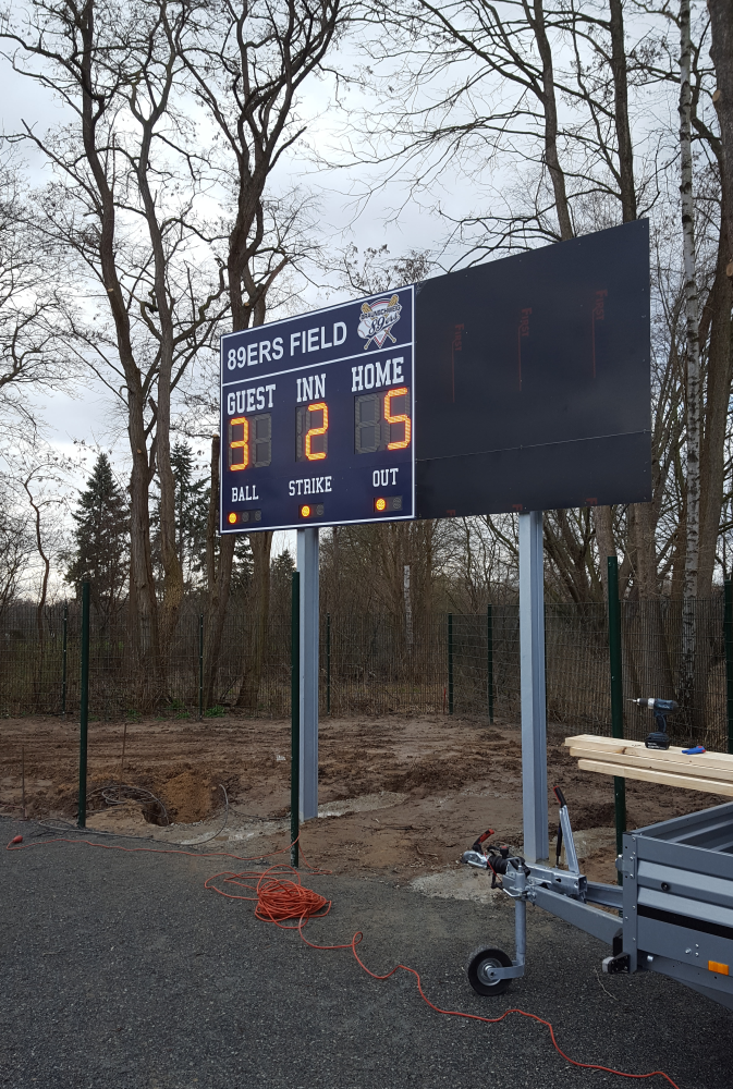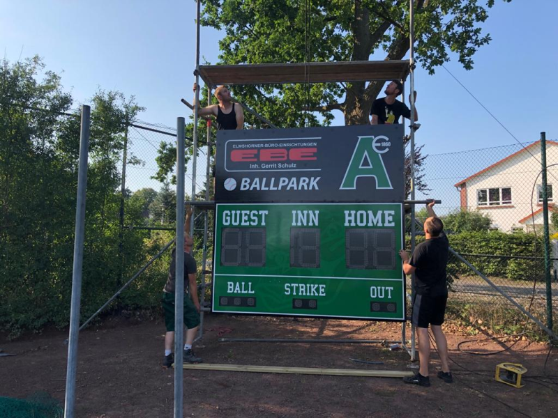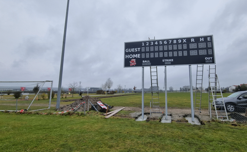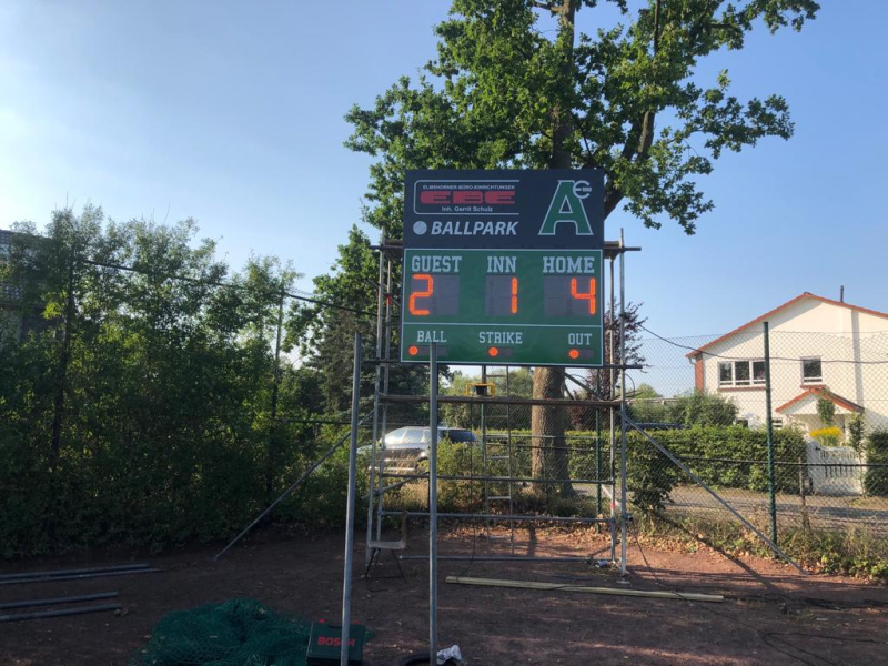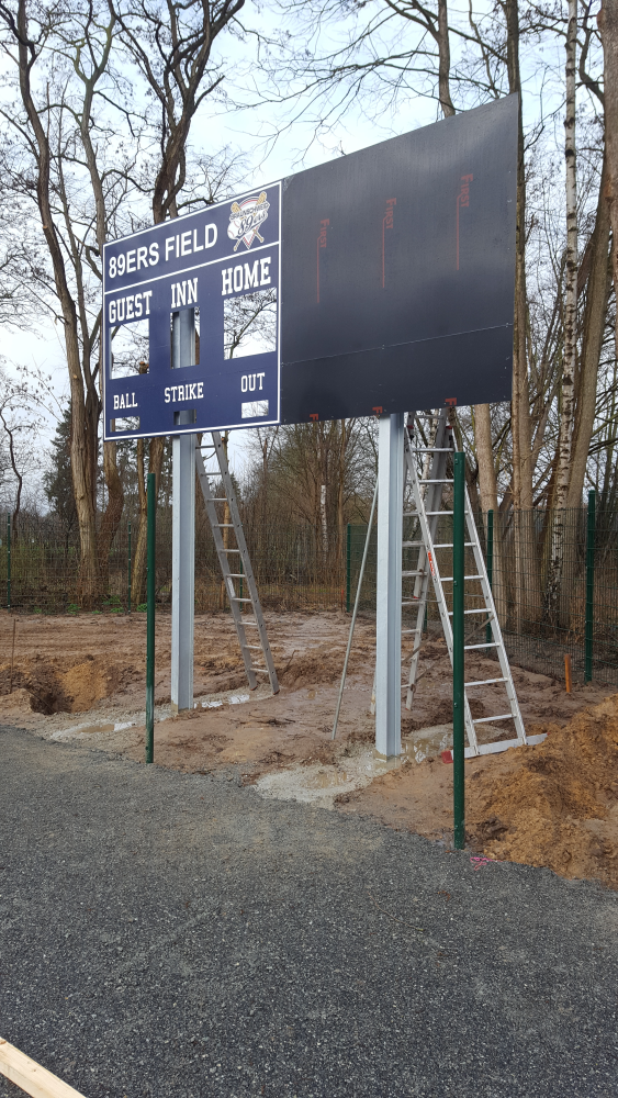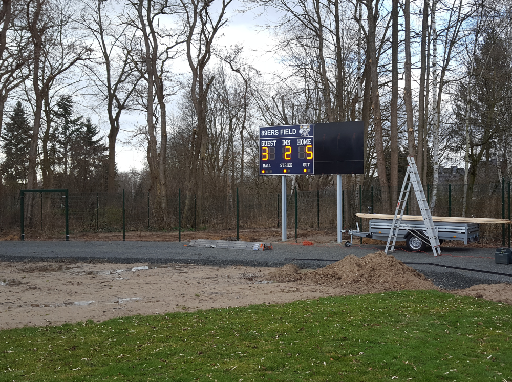 Seit dem 31.08.2019 steht ein Scoreboard bei den Baseball-Jungs, wurde erstmal provisorisch an ein Gerüst montiert. 2020 wird das Gerüst durch Stahlträger ersetzt.