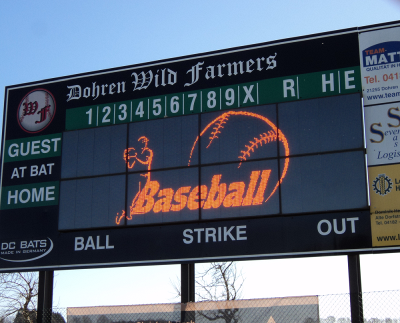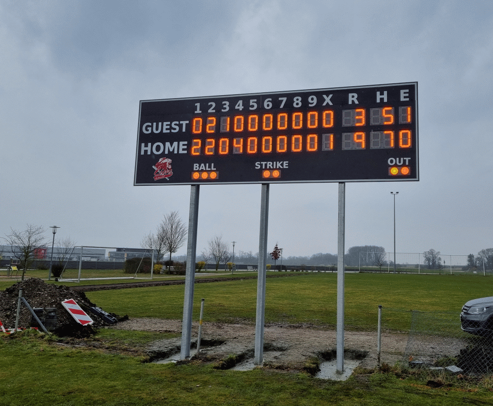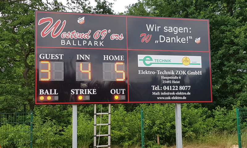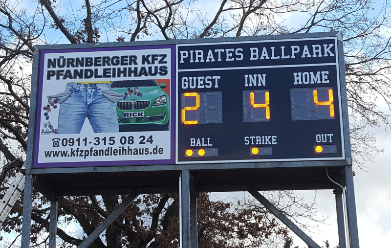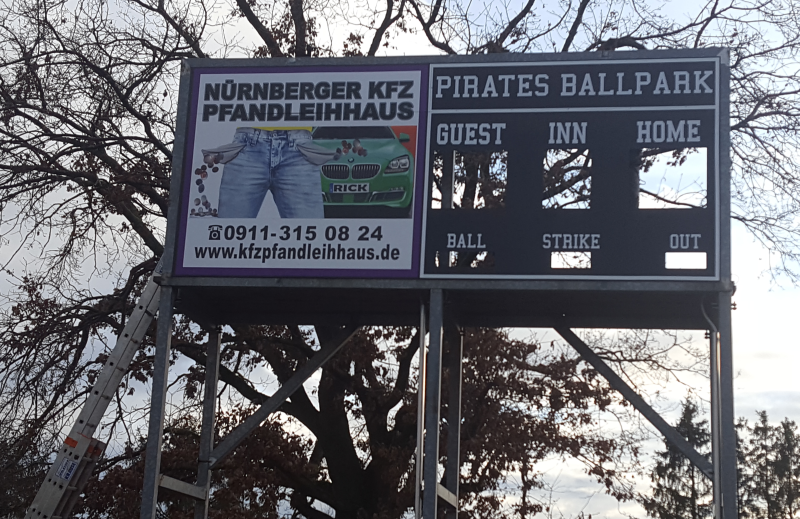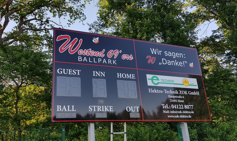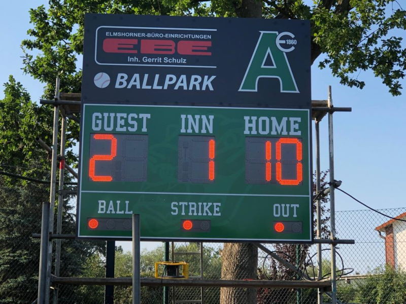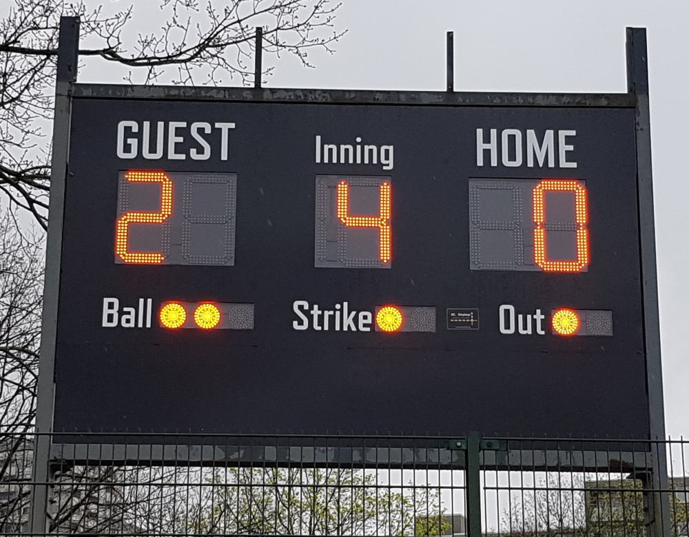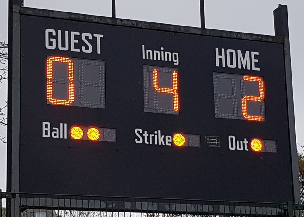 Seit dem 31.08.2019 steht ein Scoreboard bei den Baseball-Jungs, wurde erstmal provisorisch an ein Gerüst montiert. 2020 wird das Gerüst durch Stahlträger ersetzt.